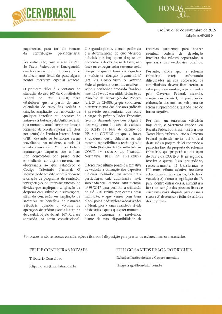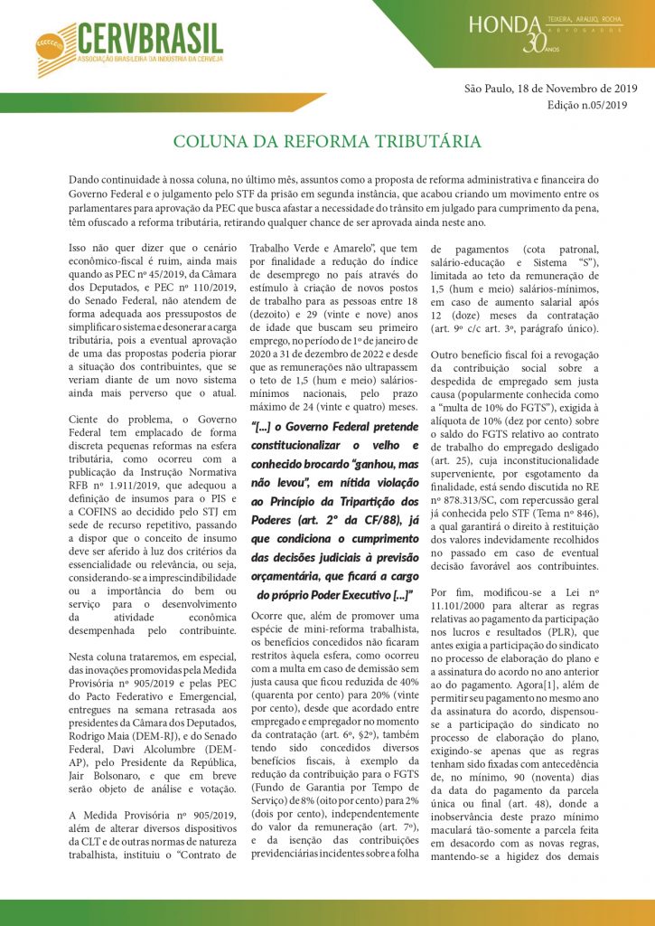 Neste sentido, a CervBrasil em parceria com o escritório Honda, Teixeira, Araújo, Rocha Advogados tem acompanhado e contribuído nos estudos e propostas nos textos da Reforma Tributária em discussão na sociedade Brasileira.